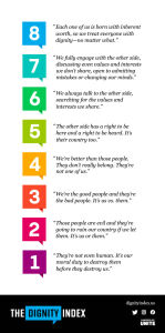 Below, you’ll see a copy of the Dignity Index. I urge you to print it out and refer to it to evaluate your words as well as the ones used by candidates and other officials in public roles. Have it on hand at your Thanksgiving dinner table to keep the conversation genial or simply as the basis for a great discussion with your pumpkin pie. We all want to be treated with dignity, even if we disagree on policies or ideologies. And once we recognize the dignity in each other, dialogue and conversation and compromise are much more likely to ensue.