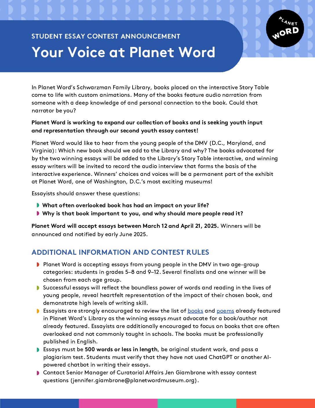 - Finalists’ essays will be featured on Planet Word’s website. Finalists may be invited to present at a public program at Planet Word.