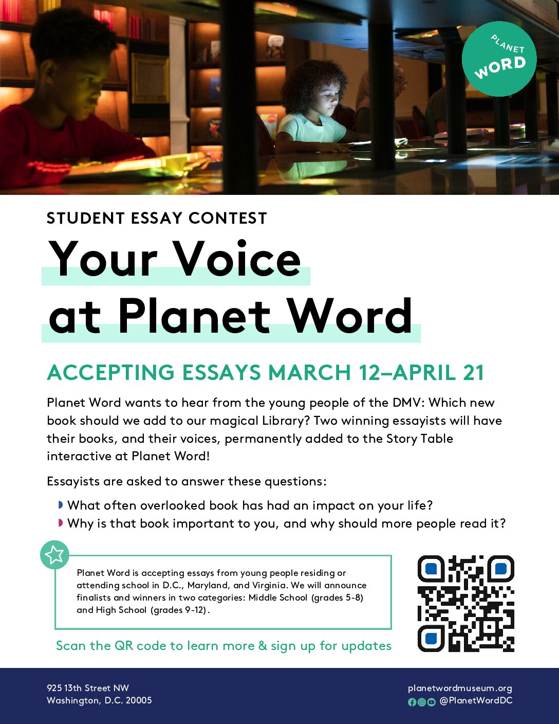 - Planet Word is accepting essays from young people in the DMV in two age-group categories: students in grades 5–8 and 9–12. Several finalists and one winner will be chosen from each age group.
